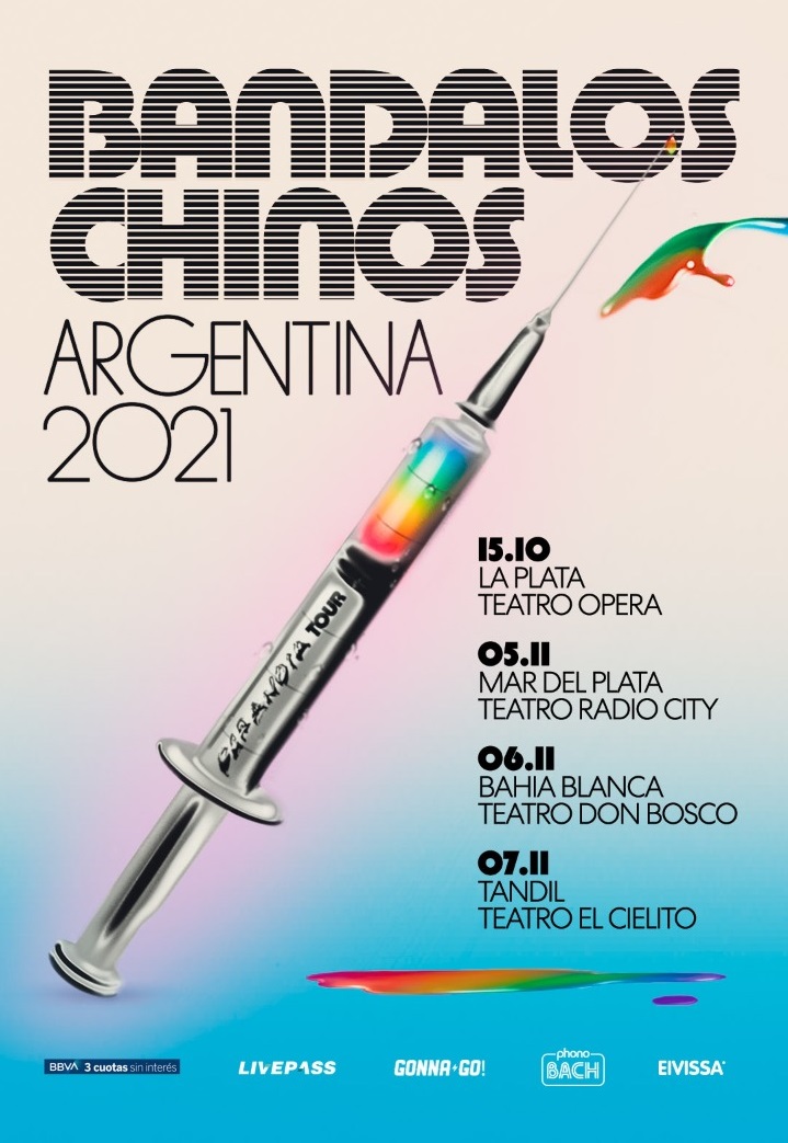 Bandalos Chinos realizará una gira por el país donde tocarán en Córdoba, Rosario, San Miguel, Mar del Plata, Bahía Blanca, Tandil y San Justo. Próximamente se anunciarán más ciudades.